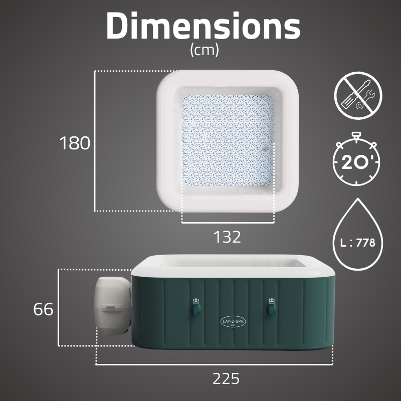 Le spa mesure 180 cm de côté (format carré) pour une profondeur de 66 cm. Une fois gonflé, il occupe environ 3,2 m² d'espace au sol, idéal pour une terrasse ou un petit jardin.