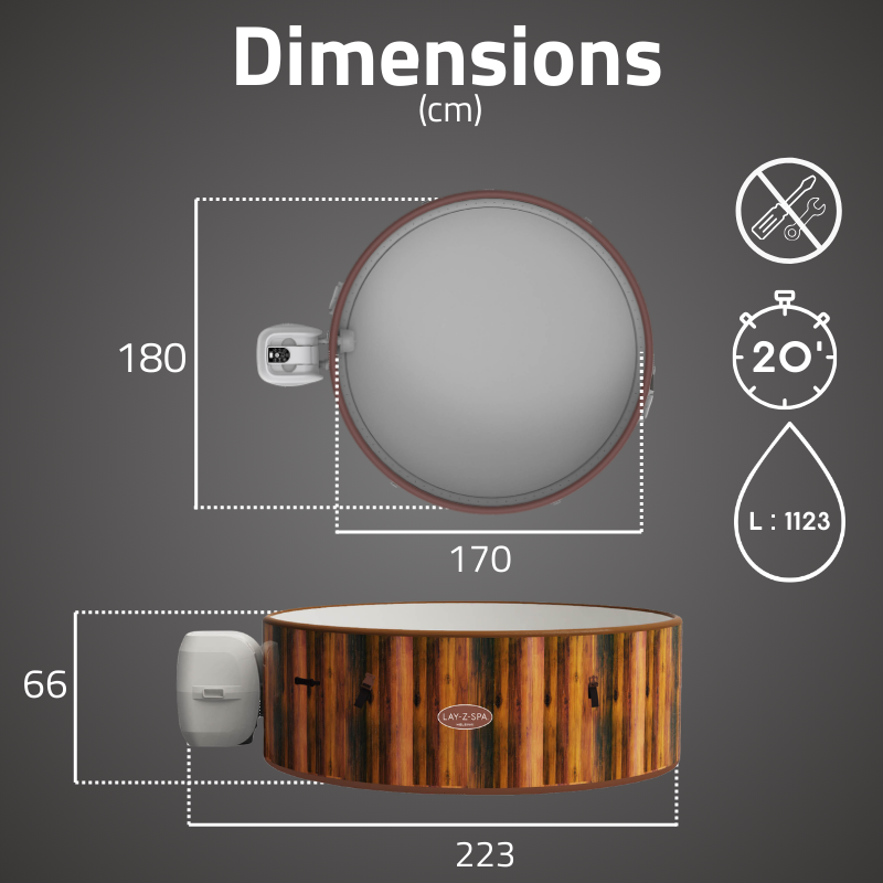 Le Lay-Z-Spa Helsinki mesure 180 cm de diamètre et 66 cm de hauteur. Il convient donc à un espace d'au moins 2m x 2m dans votre jardin.