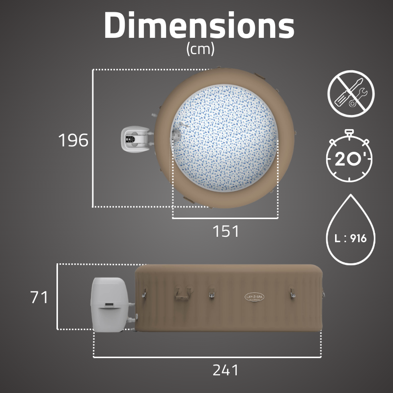 Le Lay-Z-Spa Palm Springs mesure 180 cm de diamètre pour 66 cm de hauteur. Nous recommandons de prévoir un espace d'au moins 2m x 2m pour un confort d'installation et de circulation autour du spa.
