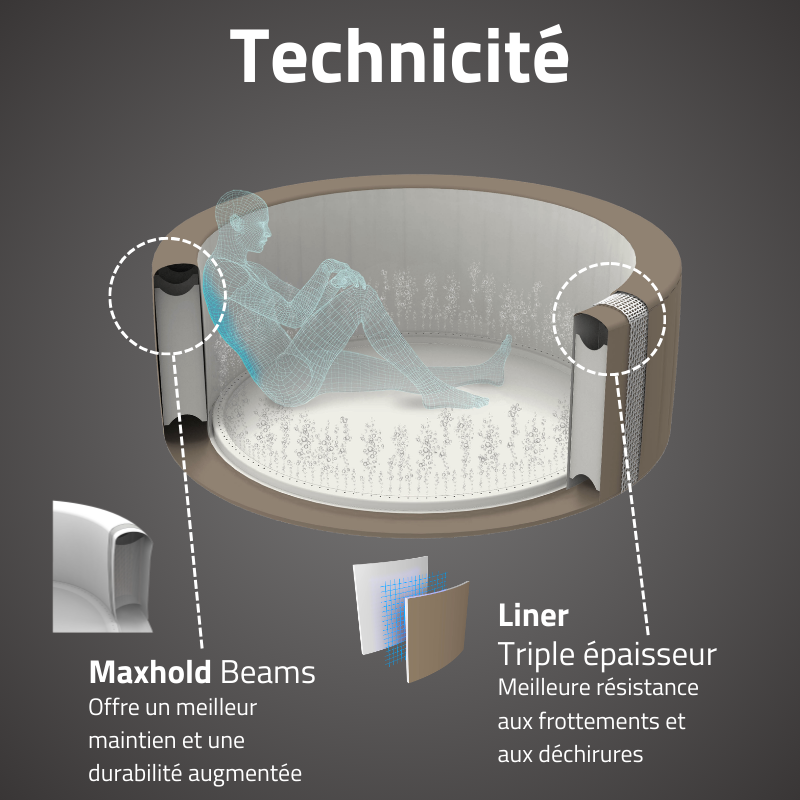 Conçu avec les technologies les plus avancées, ce spa combine robustesse et légèreté. Les renforts internes MaxHold™ garantissent une stabilité exceptionnelle et maintiennent la pression d’air durablement, tandis que les parois Tritech™ triple épaisseur résistent parfaitement aux perforations et aux chocs du quotidien. Vous bénéficiez d’un équipement fiable, qui vous accompagnera de nombreuses années.